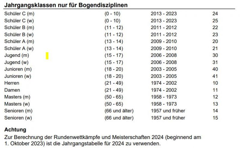 Diese Tabelle zeigt, in welchem Alter man in welcher Klasse schiesst.