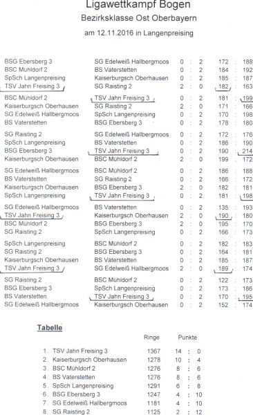 Unsere dritte Mannschaft belegt nach dem ersten von zwei Spieltagen den ersten Tabellenplatz in der Bezirksklasse Südost. Alle 7 Matches wurden gewonnen, obwohl aufgrund der diesjährigen Personalprobleme eine Rumpfmannschaft mit Jasmin, Wastl und Kurt angetreten war.